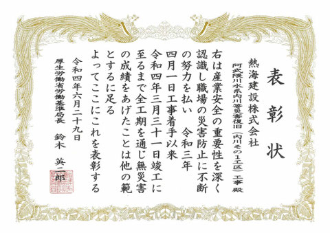 お知らせ · 2022/06/29 令和4年度 厚生労働省労働基準局長建設事業無災害表彰について 厚生労働省労働基準局長より、令和4年度建設事業無災害表彰を頂きました。 工事名:阿武隈川水系内川等災害復旧(内川その1工区)工事 tagPlaceholderカテゴリ: