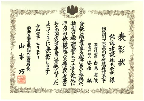 国土交通省東北地方整備局長より、令和4年度東北地方整備局優良企業表彰を頂きました。