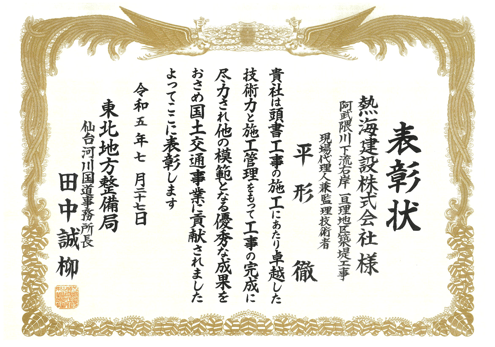 お知らせ · 2023/07/27 令和5年度 仙台河川国道事務所長施工者表彰の受賞について 国土交通省東北地方整備局仙台河川国道事務所長より令和5年度施工者表彰を頂きました。 tagPlaceholderカテゴリ: