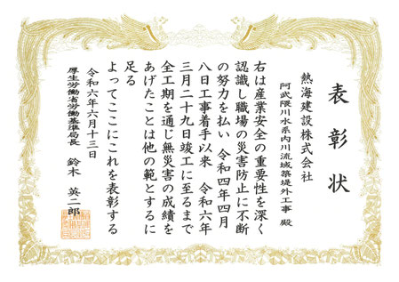 お知らせ · 2024/06/13 令和6年度 厚生労働省労働基準局長建設事業無災害表彰について 厚生労働省労働基準局長より、令和6年度建設事業無災害表彰を頂きました。 工事名:阿武隈川水系内川流域築堤外工事 tagPlaceholderカテゴリ: