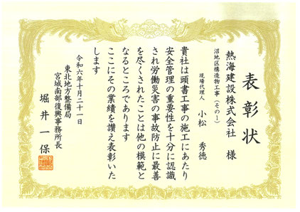 お知らせ · 2024/10/21 令和6年度 宮城南部復興事務所安全管理優良工事表彰について 東北地方整備局宮城南部復興事務所長より、令和6年度安全管理優良工事表彰を頂きました。 工事名:沼地区構造物工事(その1) tagPlaceholderカテゴリ: