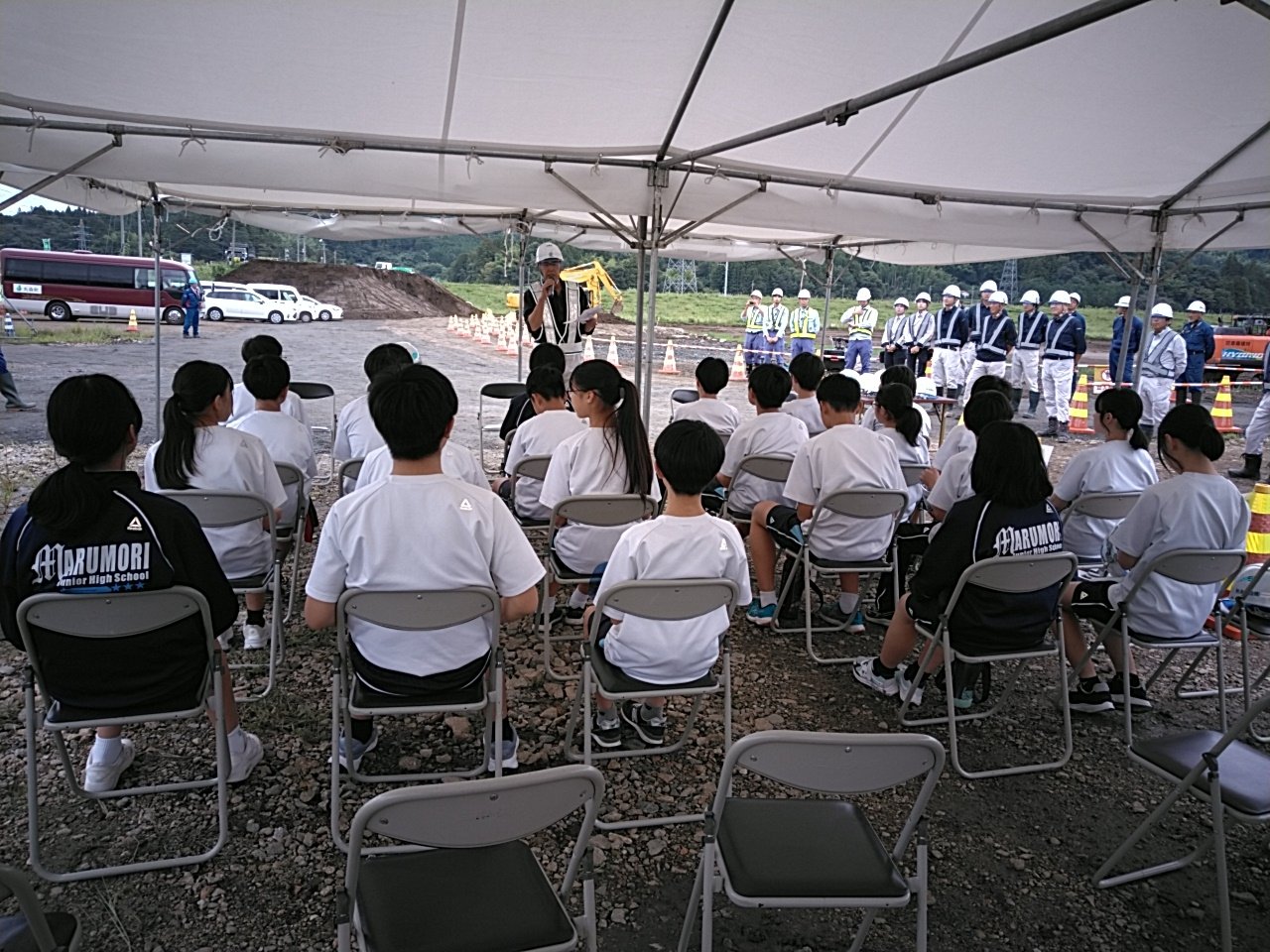 CSR · 2025/09/10 阿武隈川水系内川流域築堤外(その21)工事にて、現場見学会を行いました 令和7年9月10日(水)宮城南部復興事務所主催の「現場見学会」を、丸森中学校1年生の生徒の皆様を対象に行いました。 弊社には、阿武隈川水系内川流域築堤外(その21)工事の現場に来ていただきました。 令和元年の台風19号により甚大な被害が発生した丸森町の復旧事業を知ってもらう良い機会でした。 今日学んでいただいたことをご家族や友人と共有していただければと思います。 バックホウ操作体験 ブルドーザー搭乗体験 高所作業車搭乗体験 ドローン操作体験 tagPlaceholderカテゴリ: